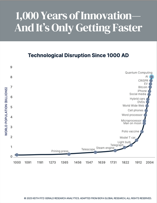 The chart below shows just how fast disruption is stacking up. From the printing press to quantum computing, each breakthrough is arriving faster than the one before—and the impact is compounding.